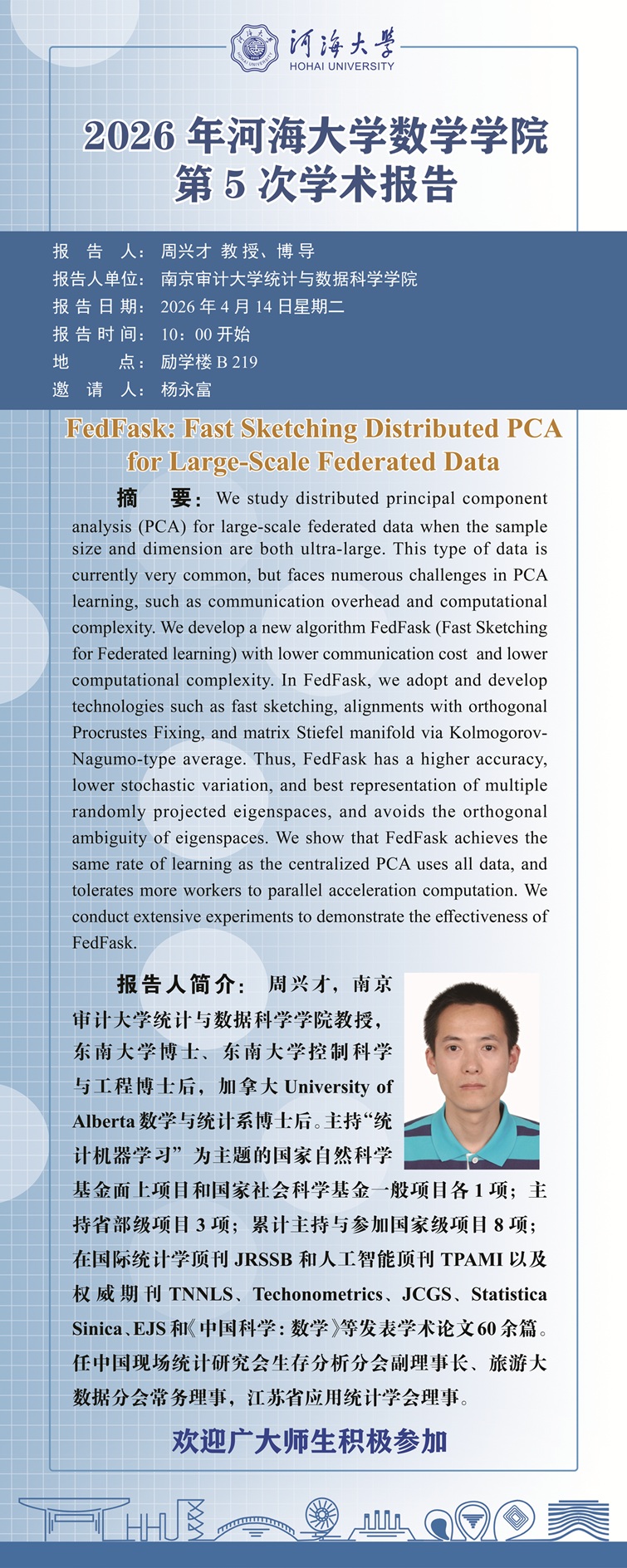 黑料不打烊 2026年第5次学术报告:FedFask Fast Sketching Distributed PCA for Large-Scale Federated Data