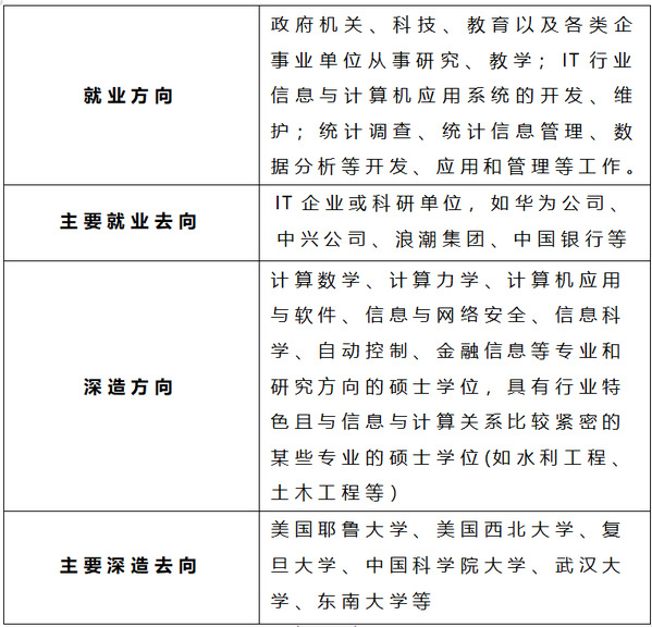 ▲本专业是以计算数学为基础,信息行业为背景,培养学生具有宽厚的数学基础和思维能力,掌握信息技术和计算科学的基本理论、方法与技能的数学类本科专业。