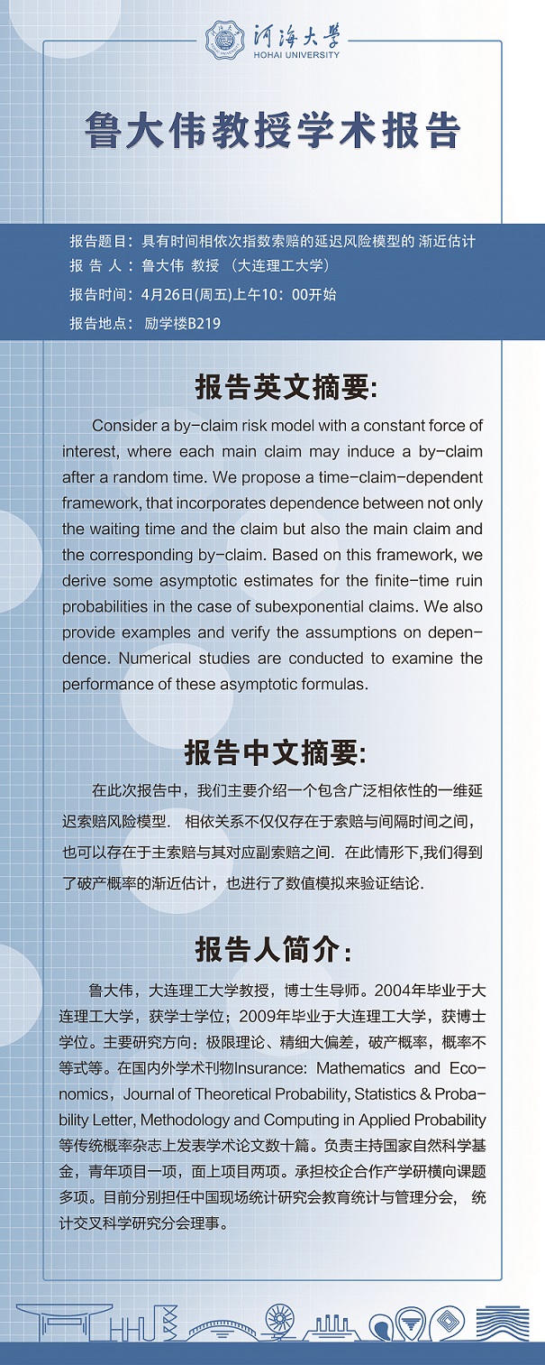 黑料不打烊 2024年第6次学术报告:具有时间相依次指数索赔的延迟风险模型的渐近估计