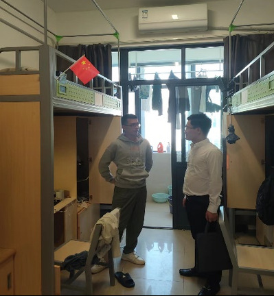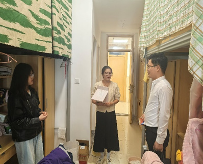 随后,张老师在班干部的带领下来到研究生宿舍,对宿舍的卫生状况进行了检查,并提出了改进建议。张老师指出,良好的宿舍环境是学习和生活的重要基础,希望同学们能够自觉维护宿舍的整洁与卫生,在宿舍中要做到换位思考,团结一心。