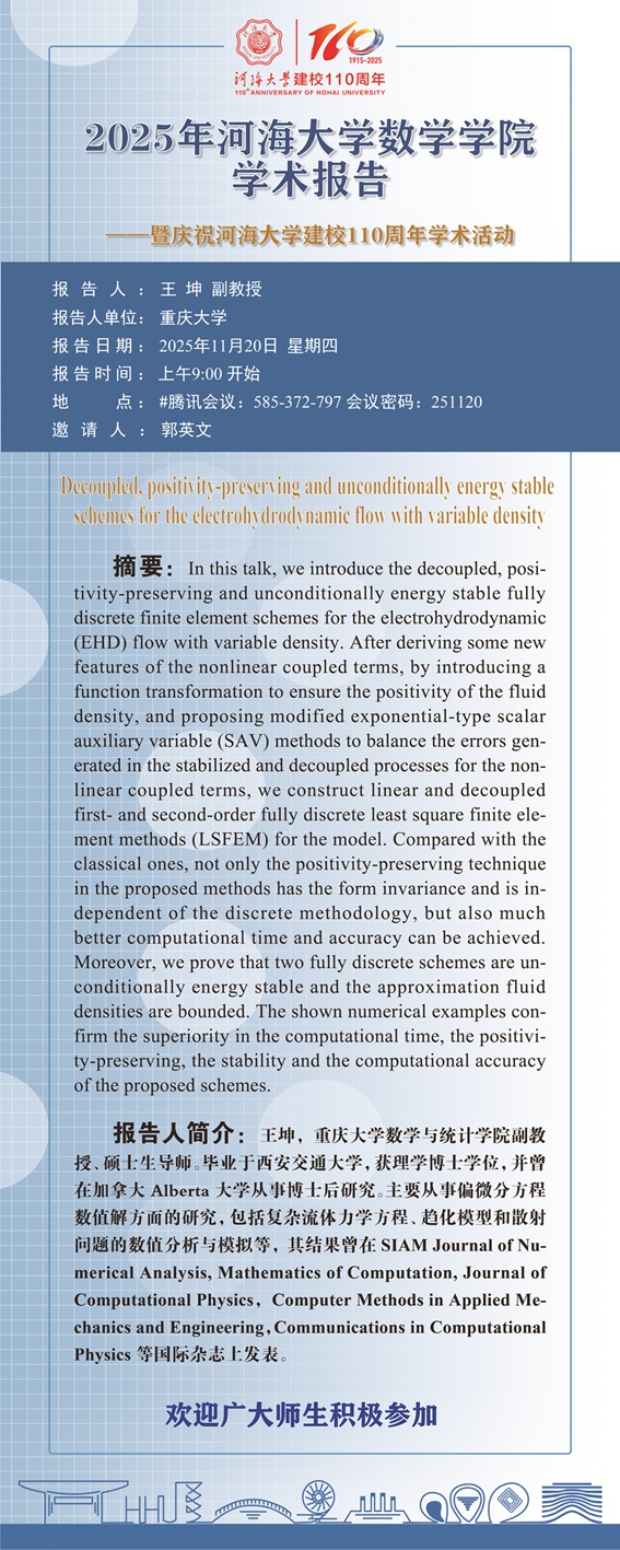 黑料不打烊 第29次学术报告:Decoupled, positivity-preserving and unconditionally energy stable schemes for the electrohydrodynamic flow with variable density